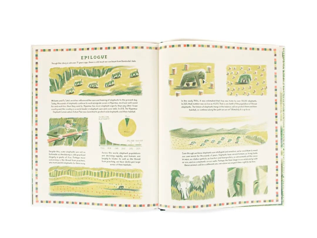 本书根据真实故事改编,在这个动人故事中,作者William Grill通过令人惊叹的插图展示了缅甸森林和山脉的壮丽、描写了人与动物之间的真情实感、讲述了一个温馨且动人的故事。虽然世界充满了危险,但人与动物的合作还是产生了巨大的能量,这本书也为小朋友们介绍了大象的保护和护理知识。